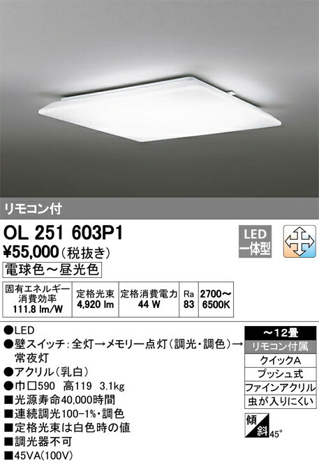 ODELICオーデリック LEDシーリングライト〜12畳調光・調色タイプOL251603P1